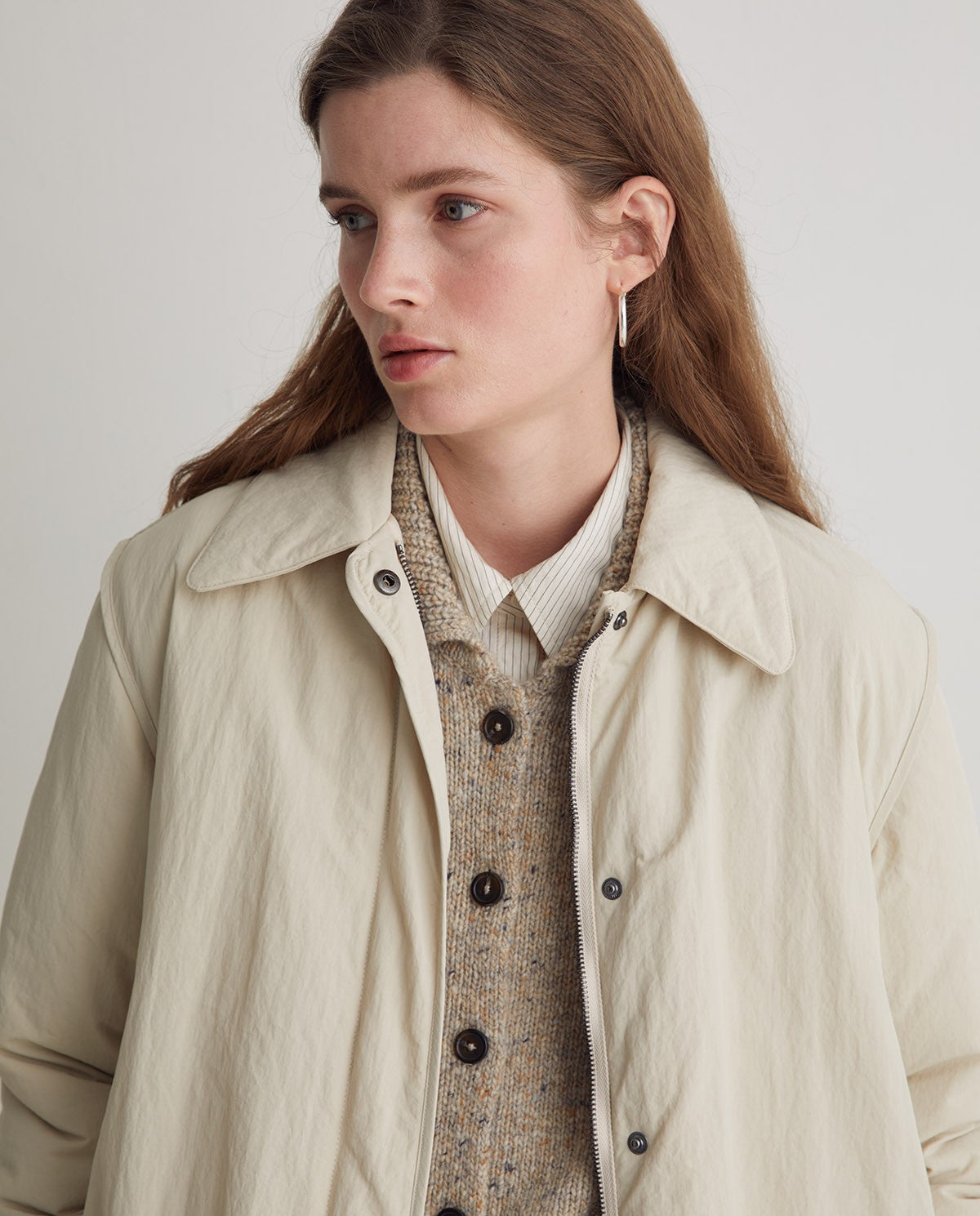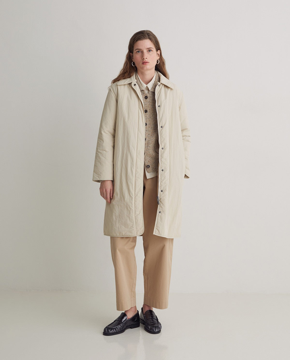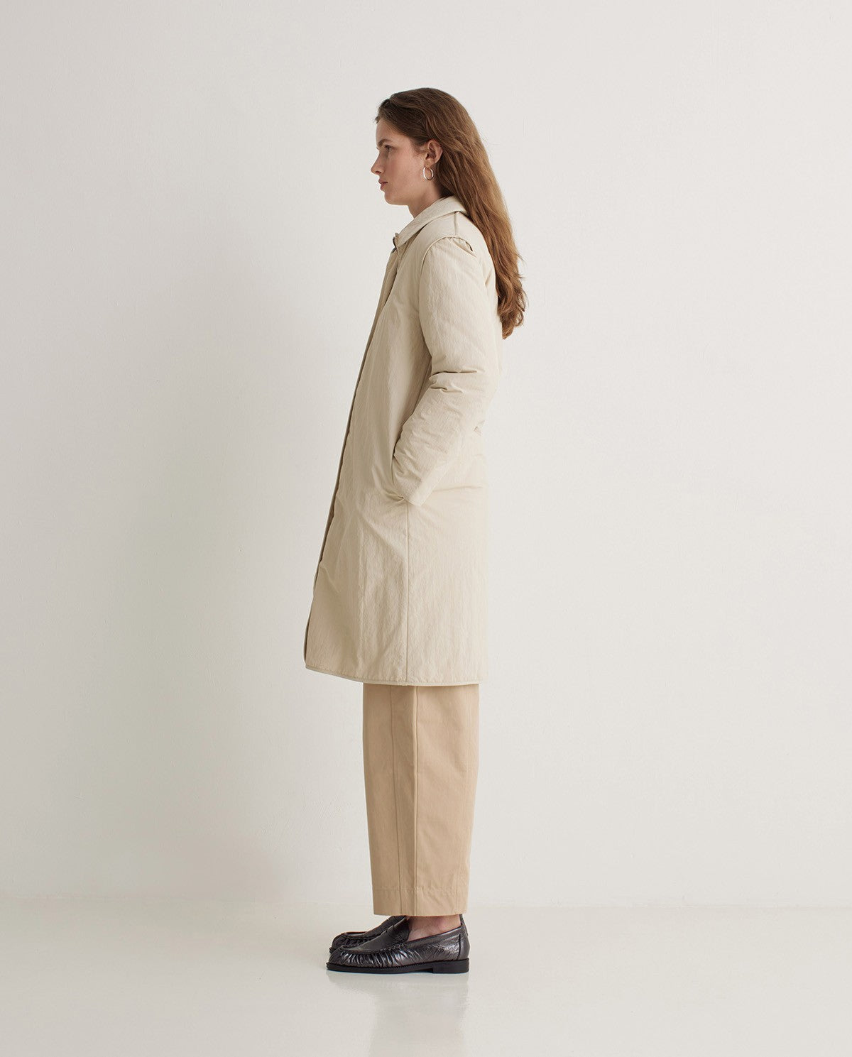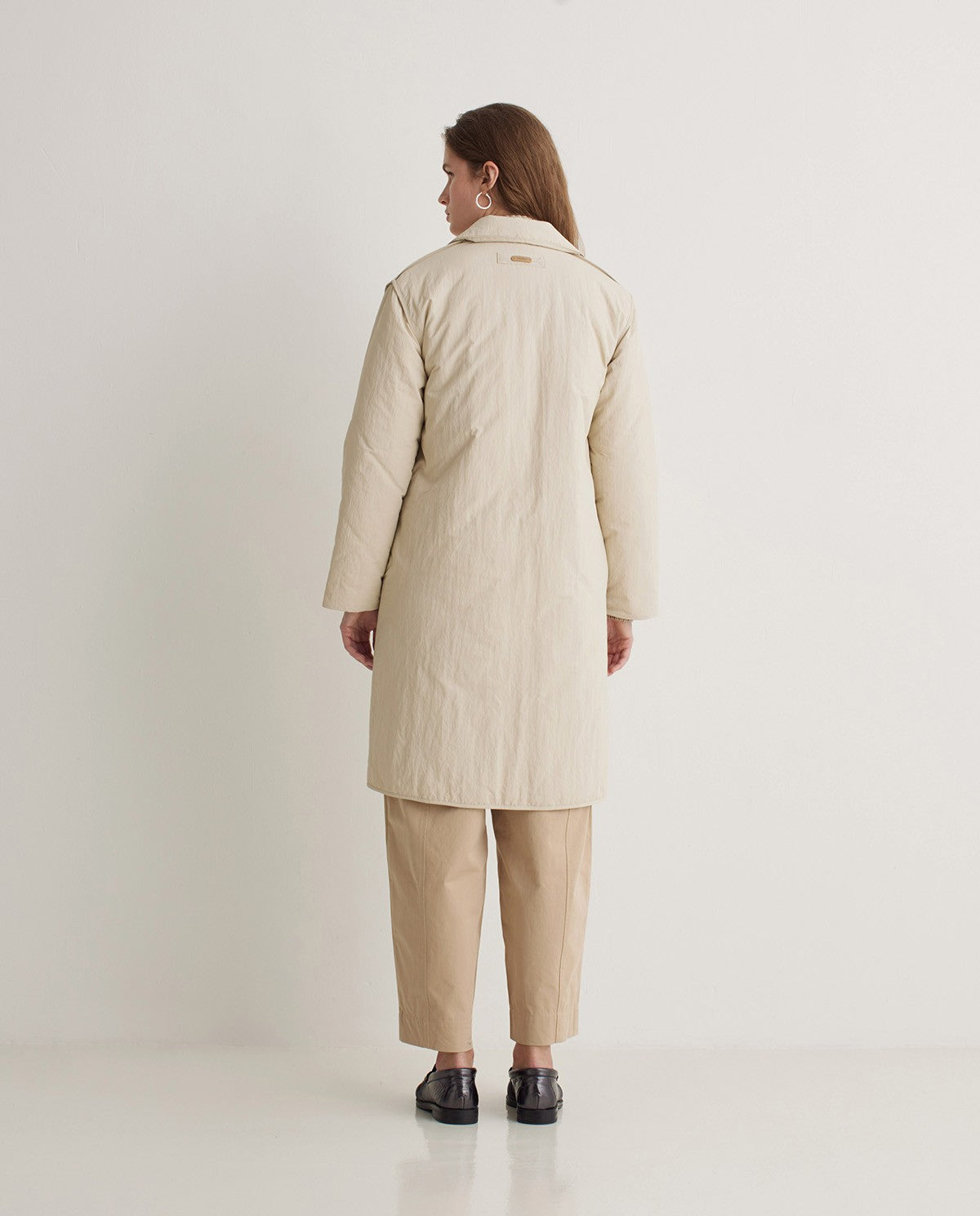 Abrigo acolchado water repellent confeccionado con fibras recicladas, corte recto con cuello camisero, cierre con cremallera y botones a presión.