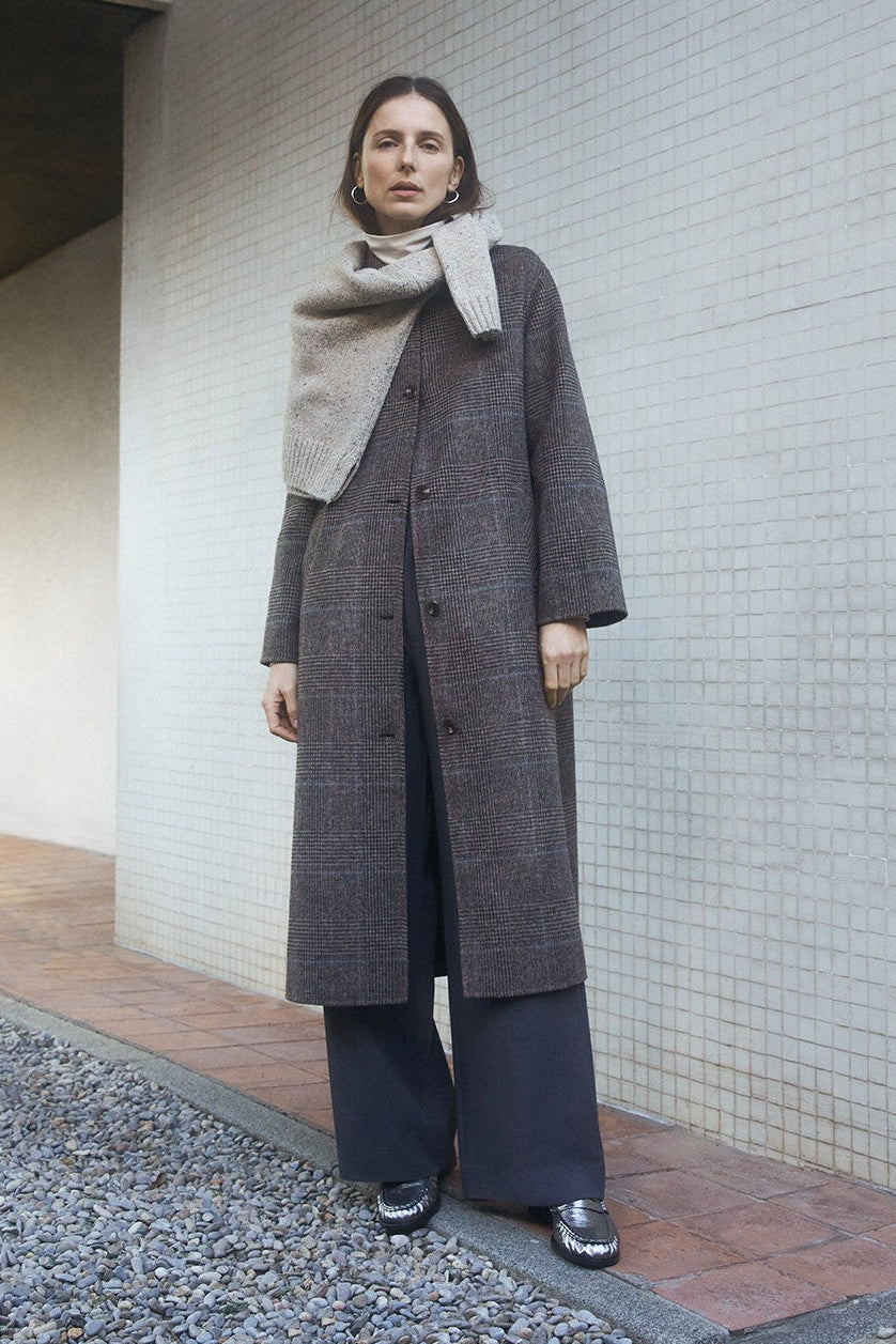 Abrigo largo handmade, tejido mezcla de lana y fibras recicladas sin forro. Estampado de cuadros, cuello camisero. Cierre frontal con botones estilo carey y bolsillos laterales.