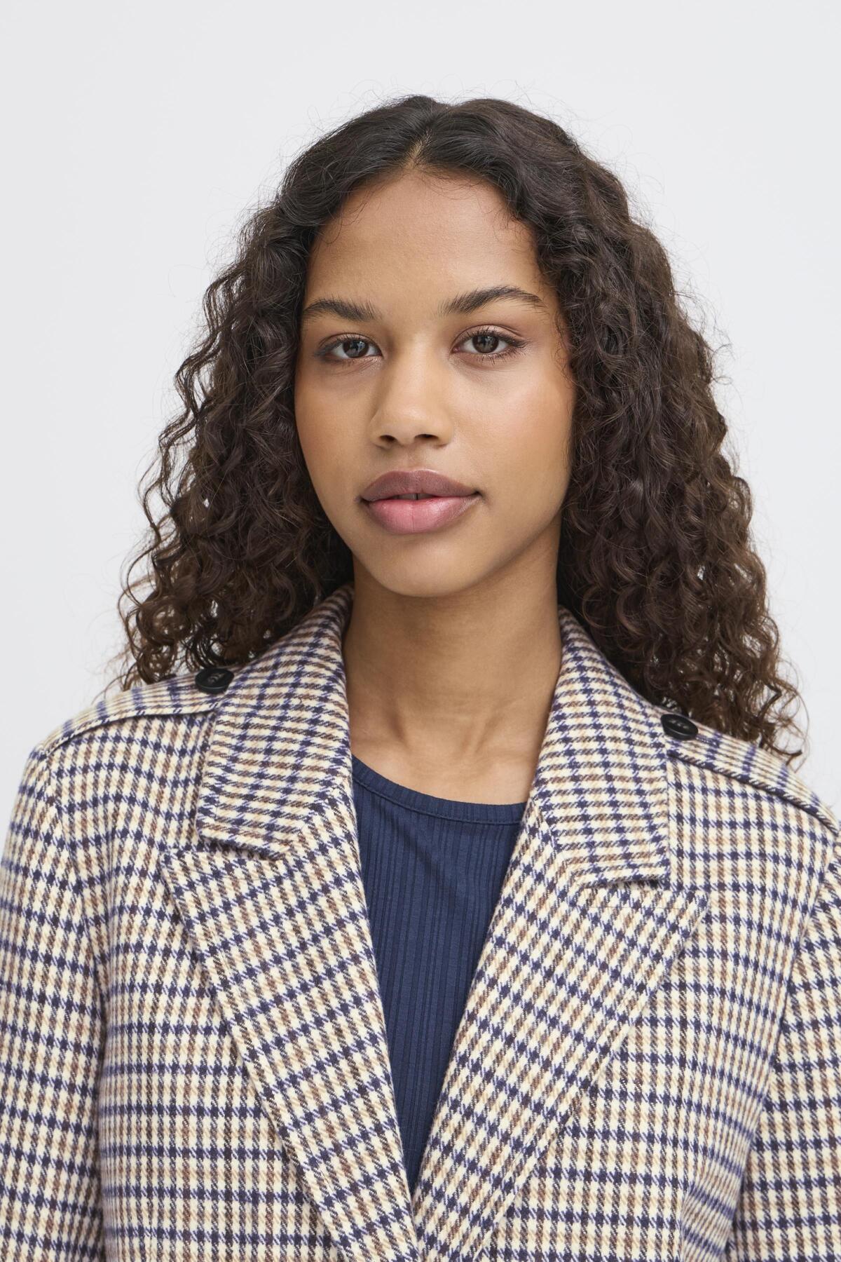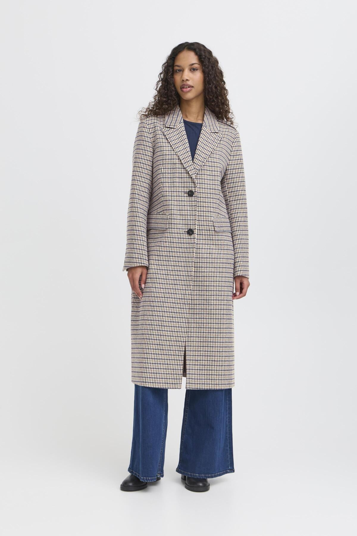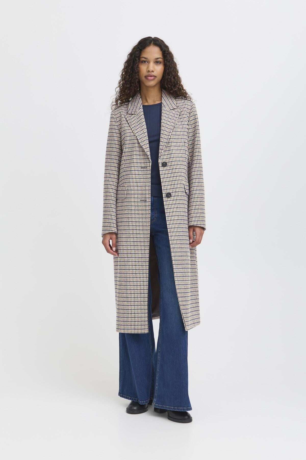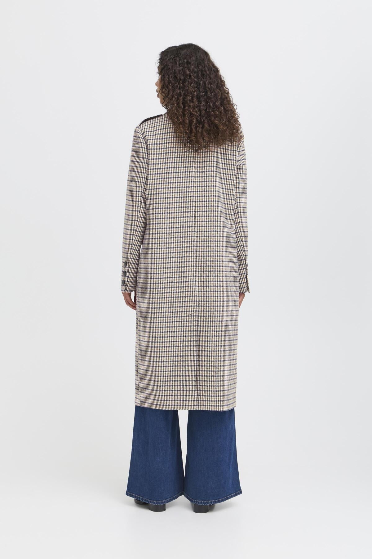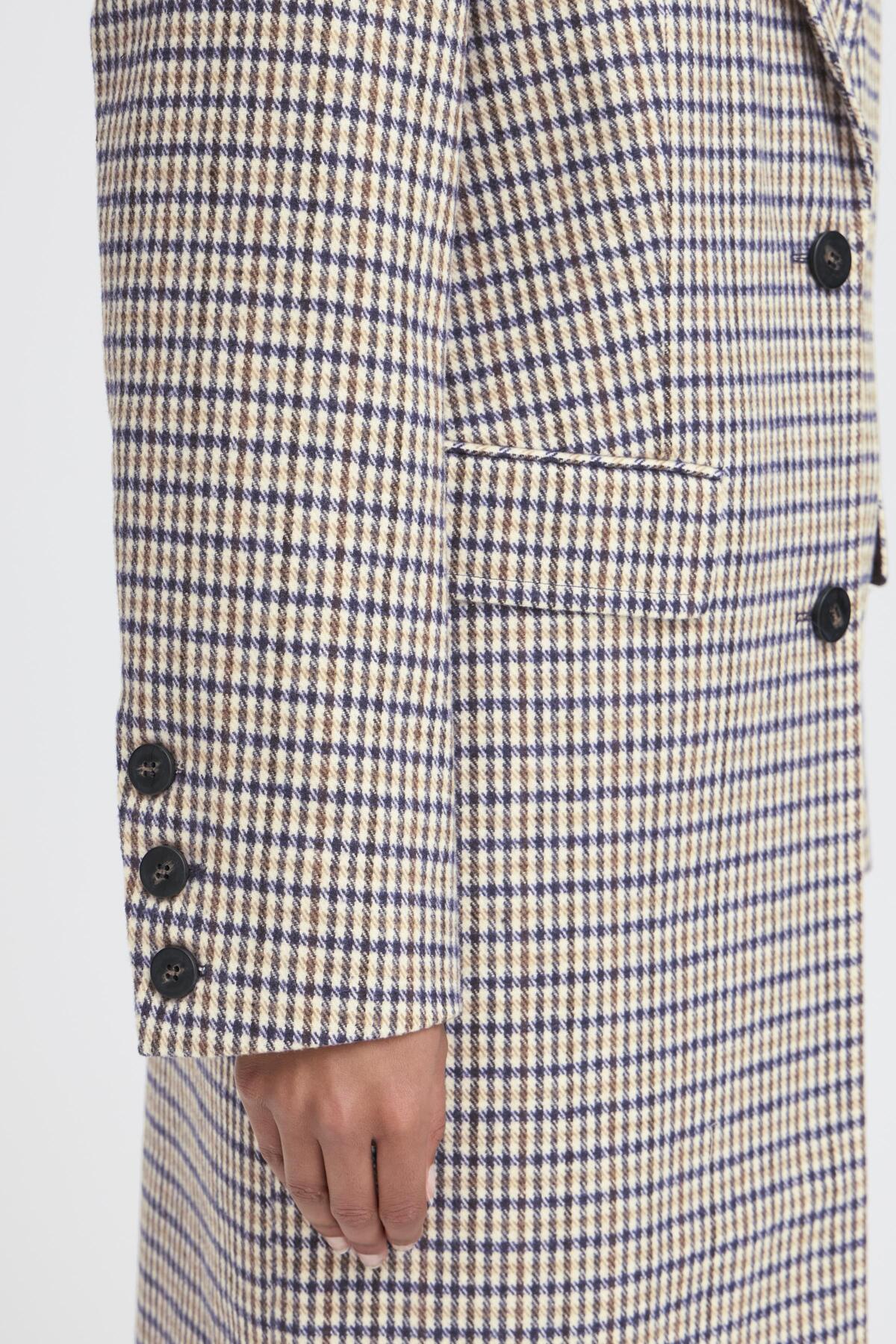Abrigo largo de cuadros azul y crudo, detalle de solapas en hombro, cierre con botones y bolsillos frontales.