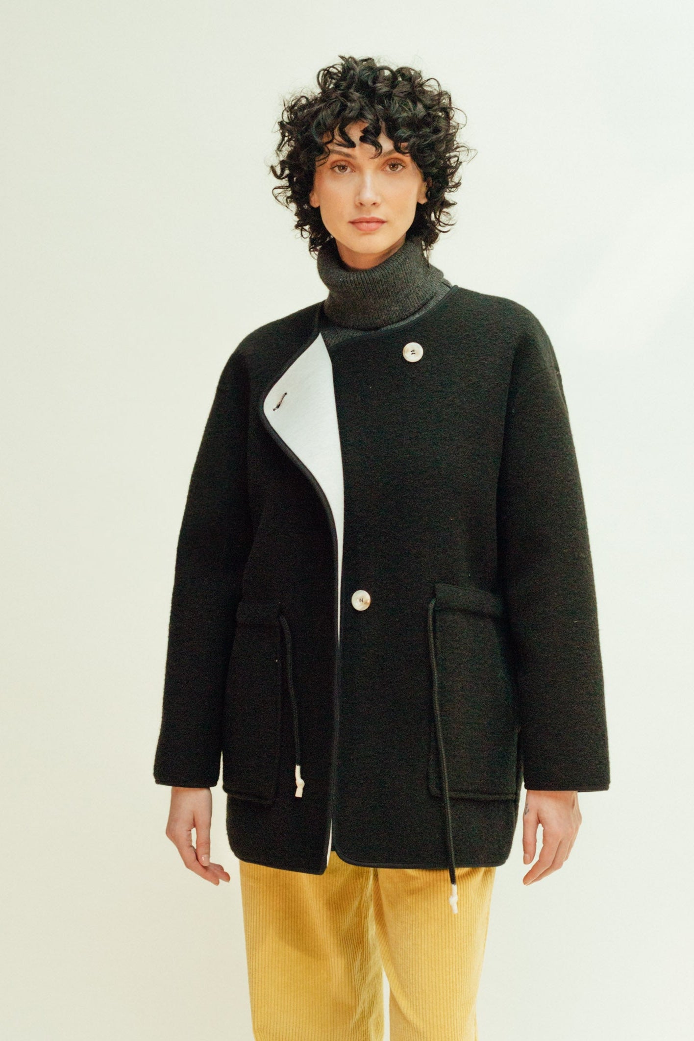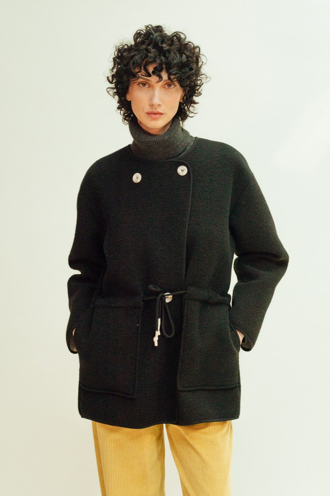 Abrigo lana cocida en exterior y neopreno en interior, cierre con botones cruzado en cuello, bolsillos cuadrados frontales y cintura ajustable con cordón.