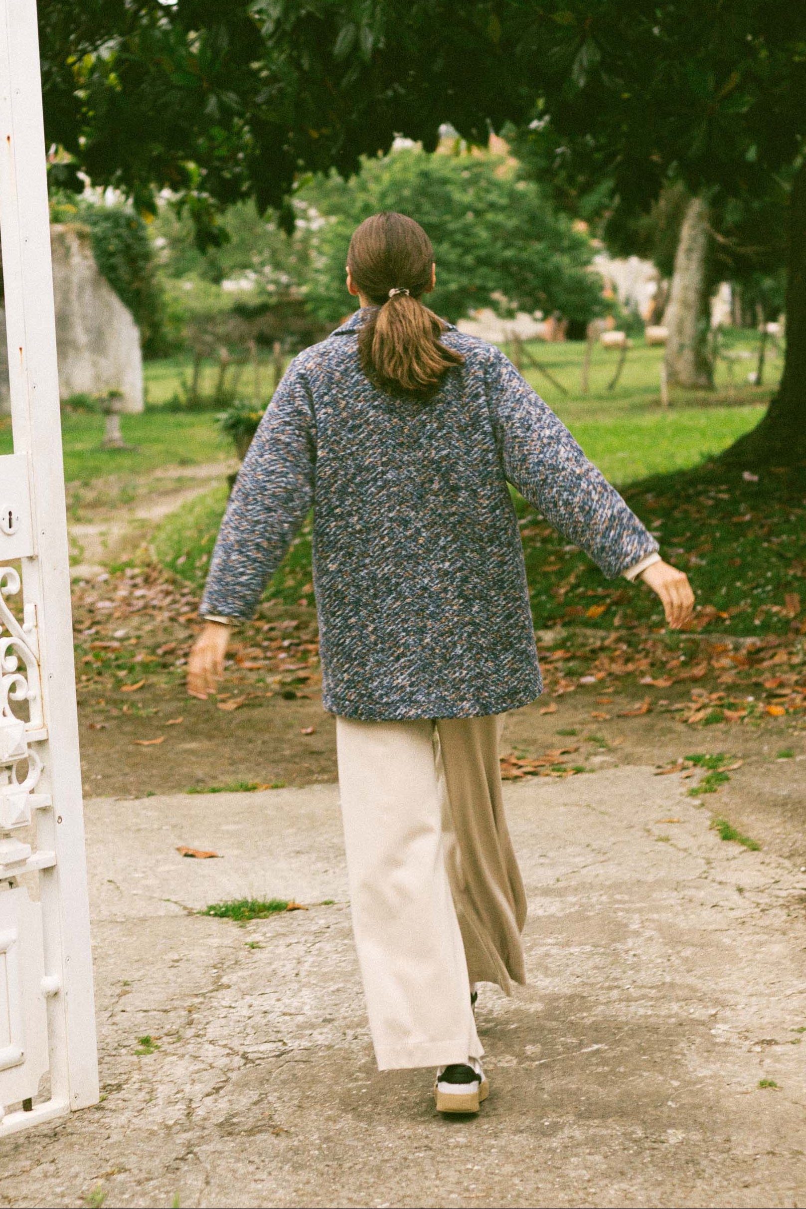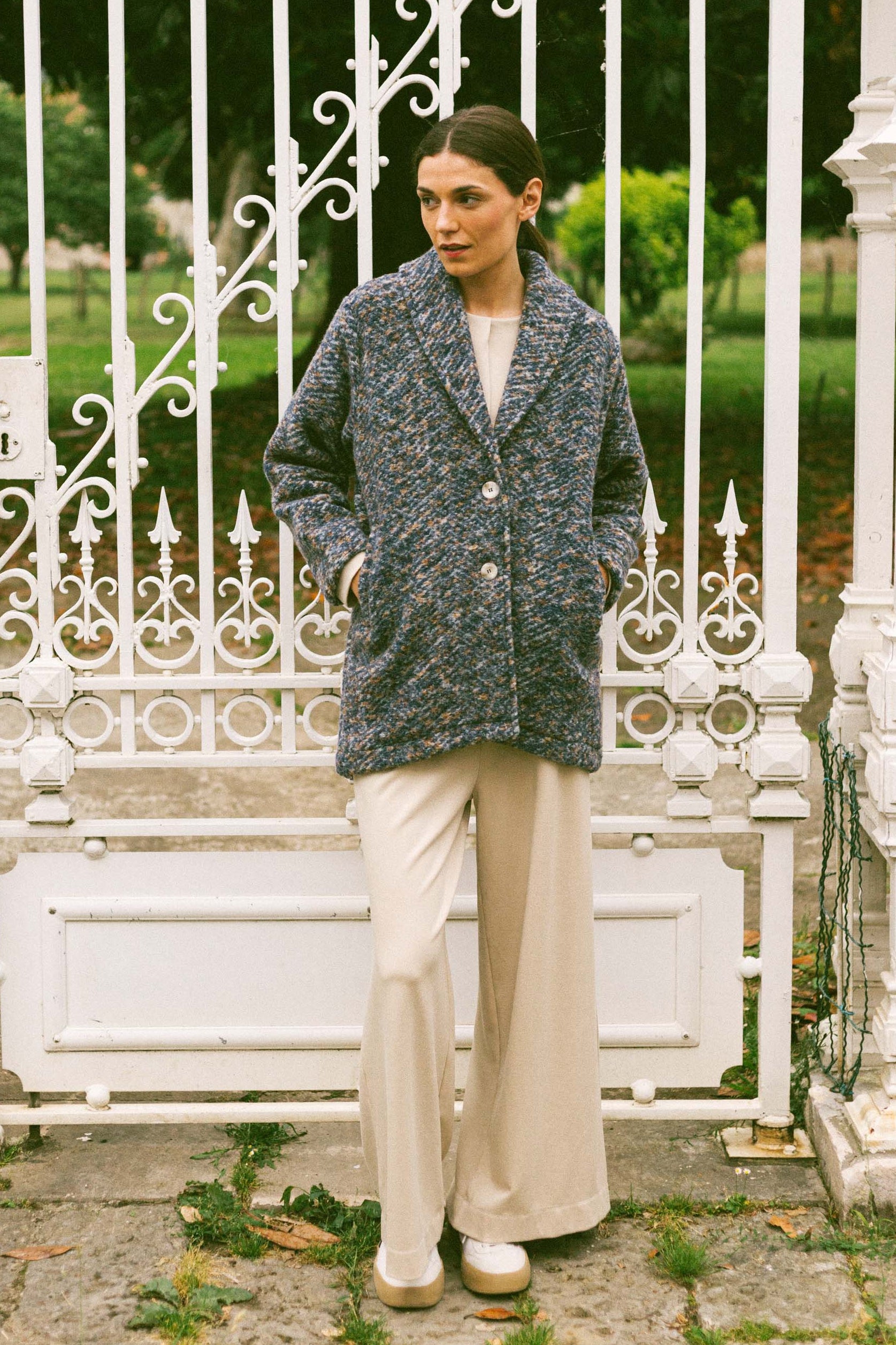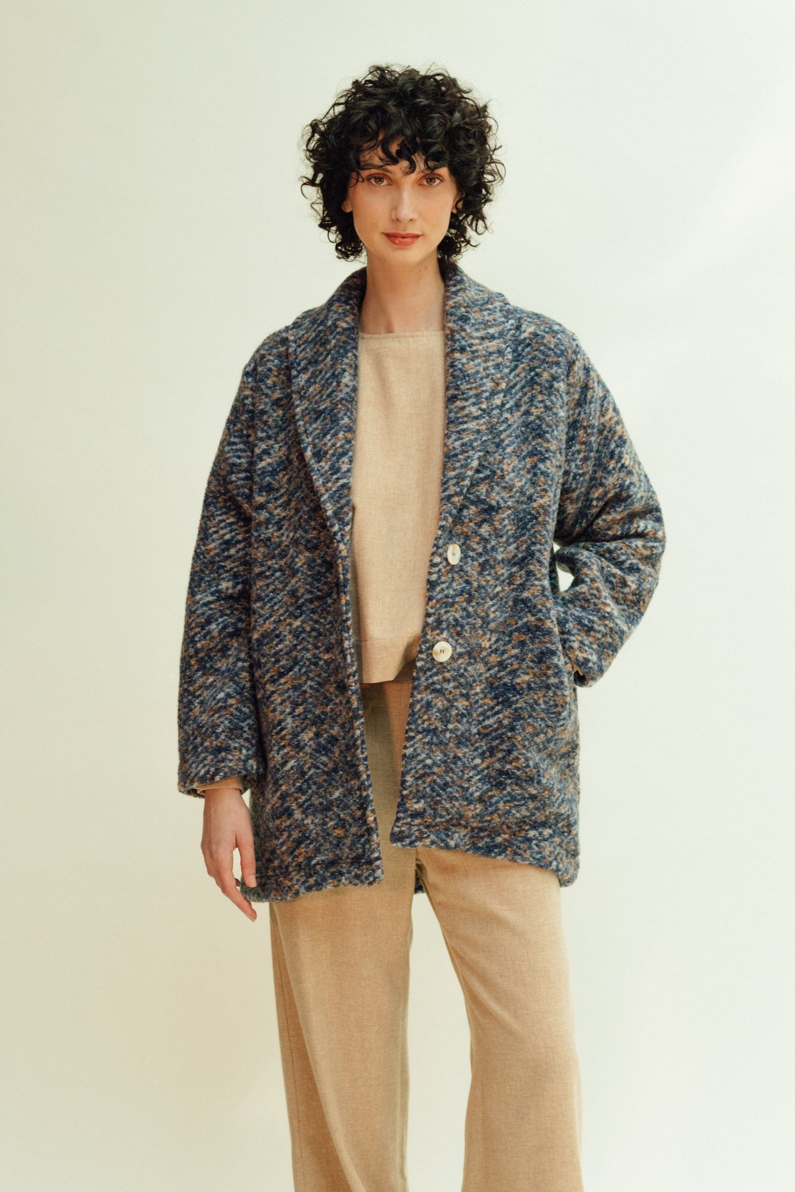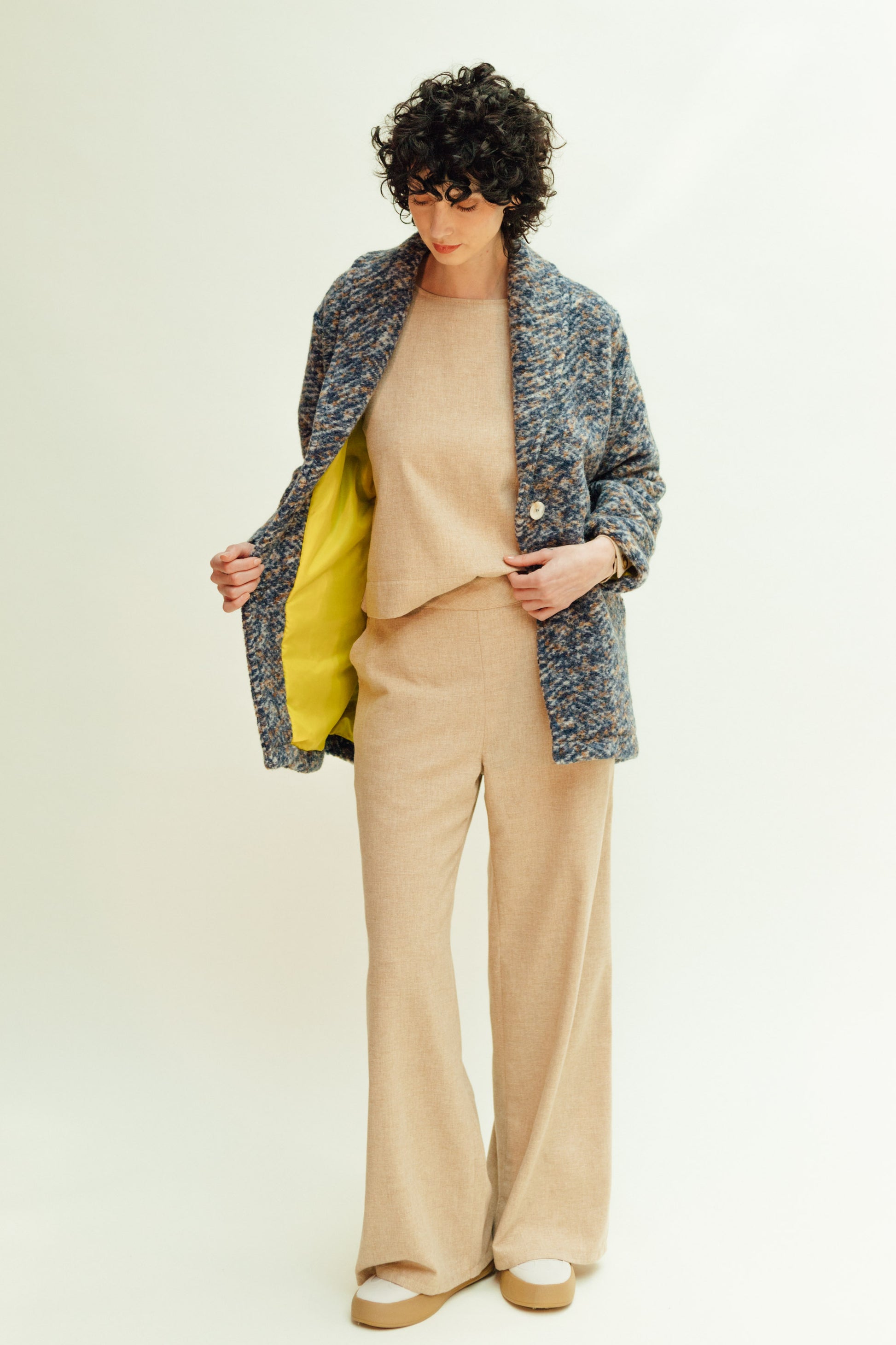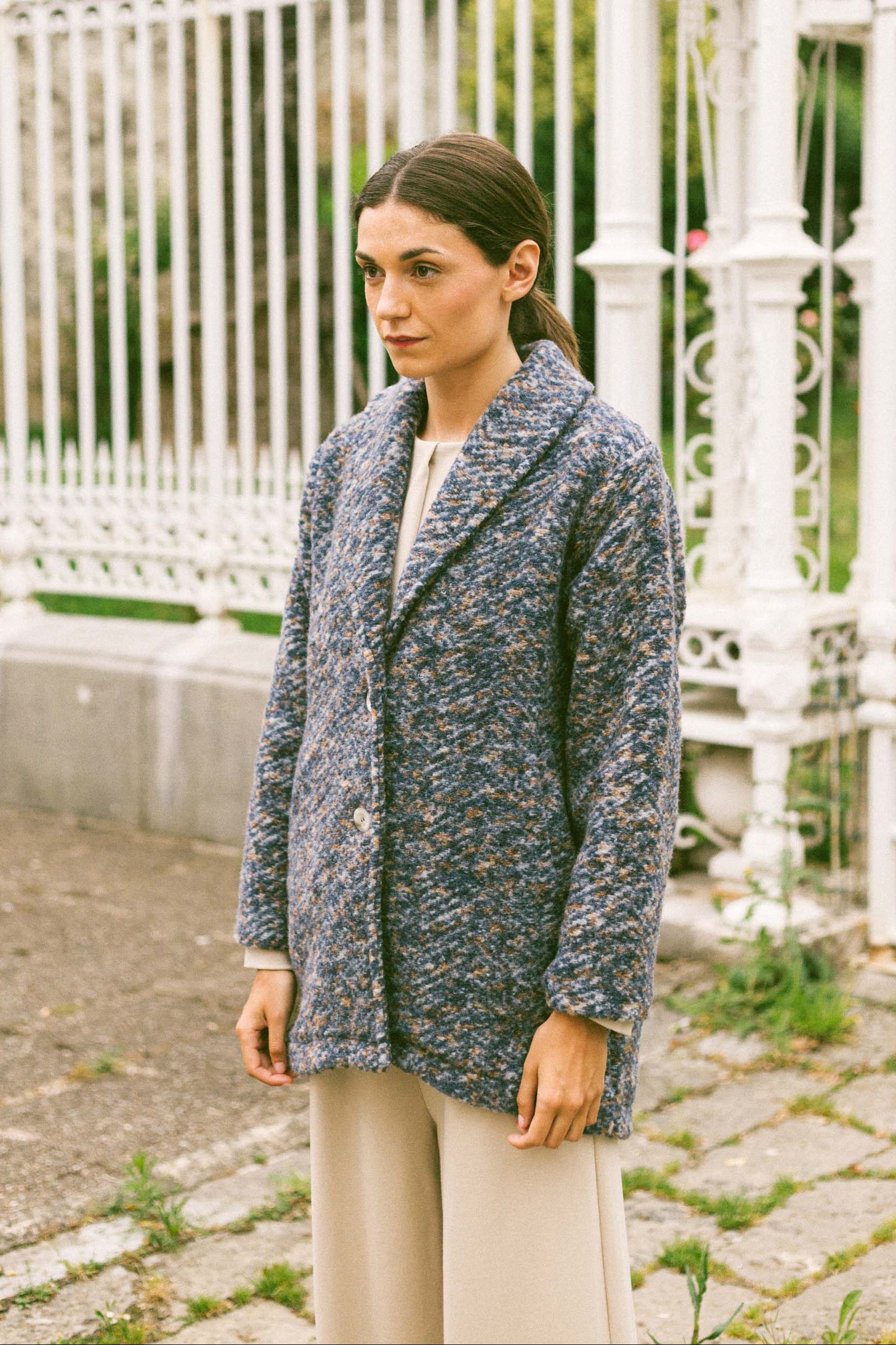 Abrigo de lana jaspeado en tonos azules y marrones con forro amarillo a contraste. Cierre con botones y bolsillos laterales. No pesa nada y es muy calentito.