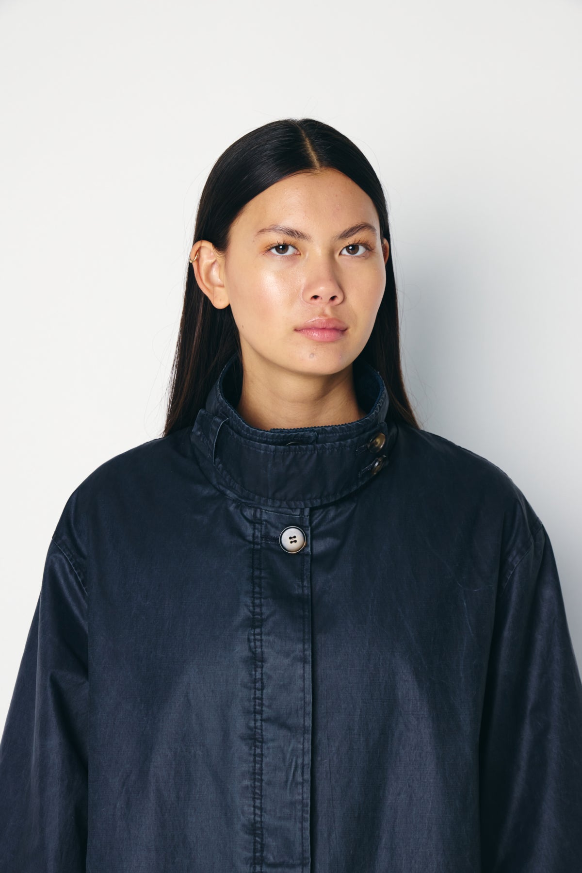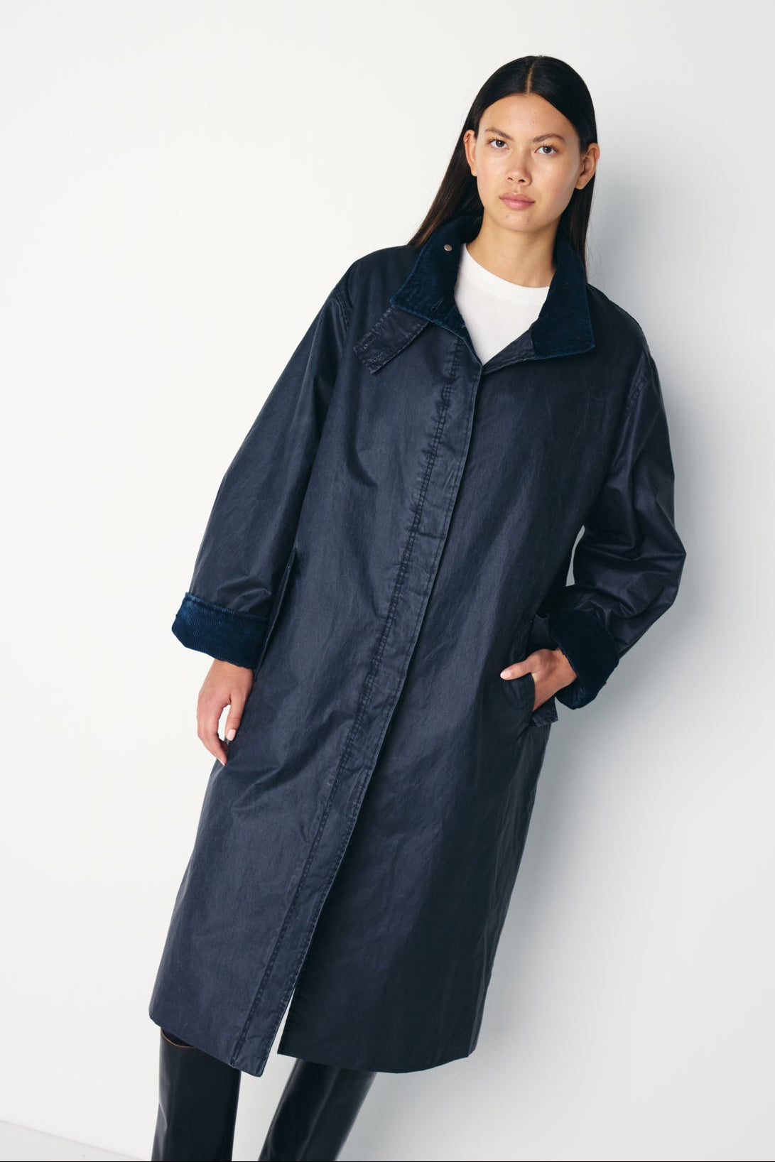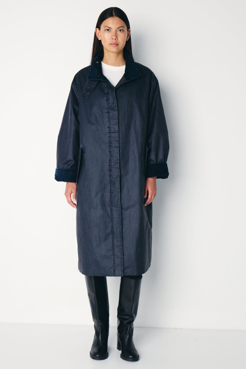 Abrigo largo acolchado, corte recto, tejido impermeable en azul marino, cuello y puños en pana. Cierre con botones, bolsillos laterales y cuello subido. Talla amplio