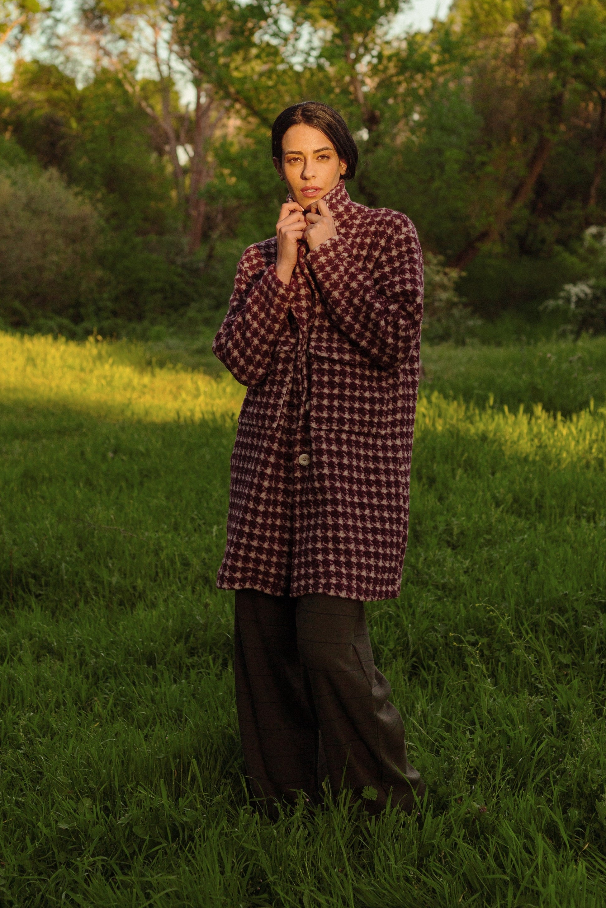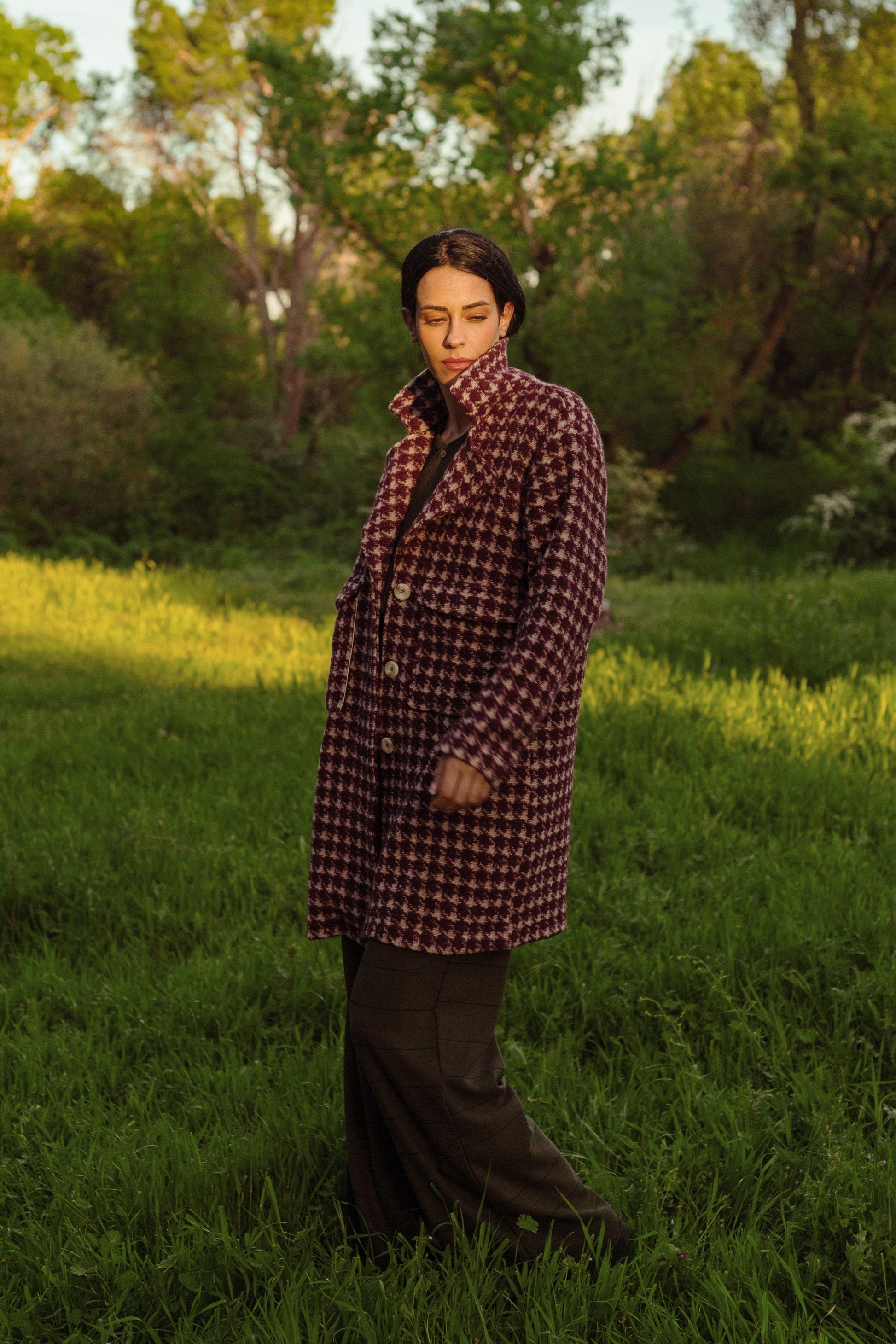 Abrigo de lana sin forro, dibujo en espiga granate/burdeos, cuello en solapas y bolsillos cuadrados frontales.