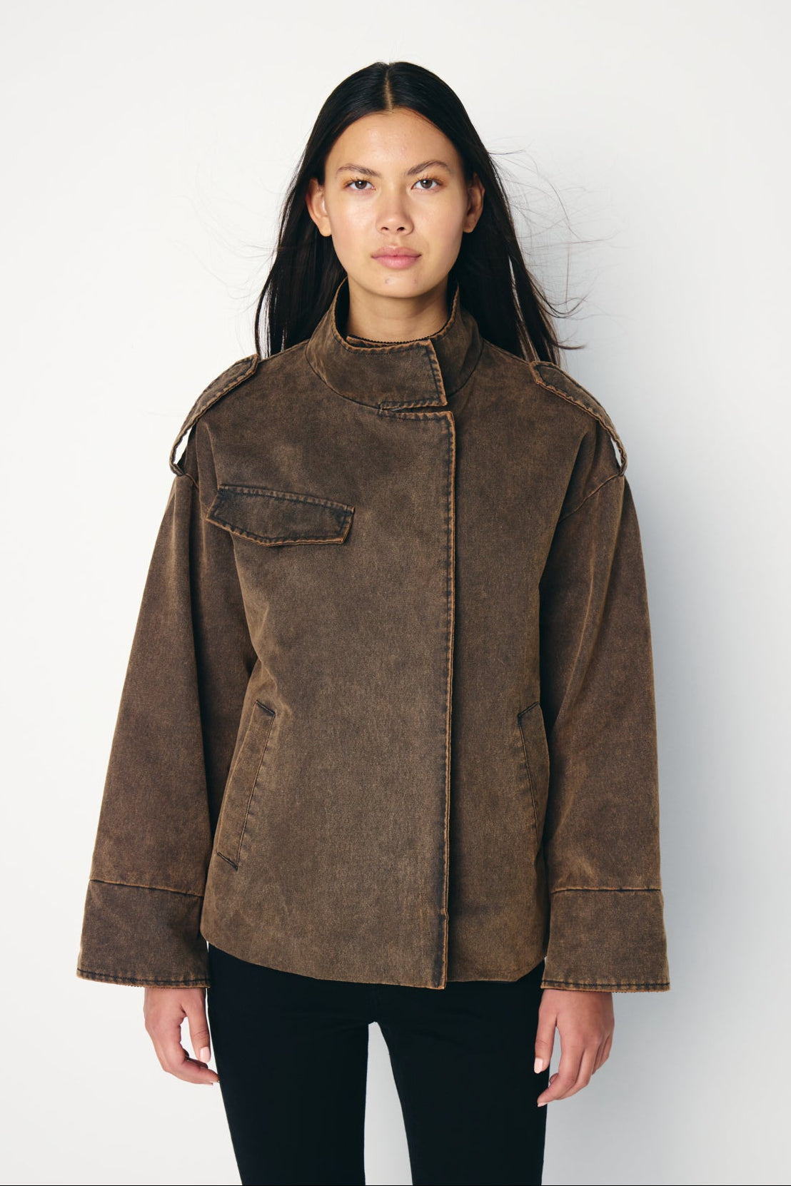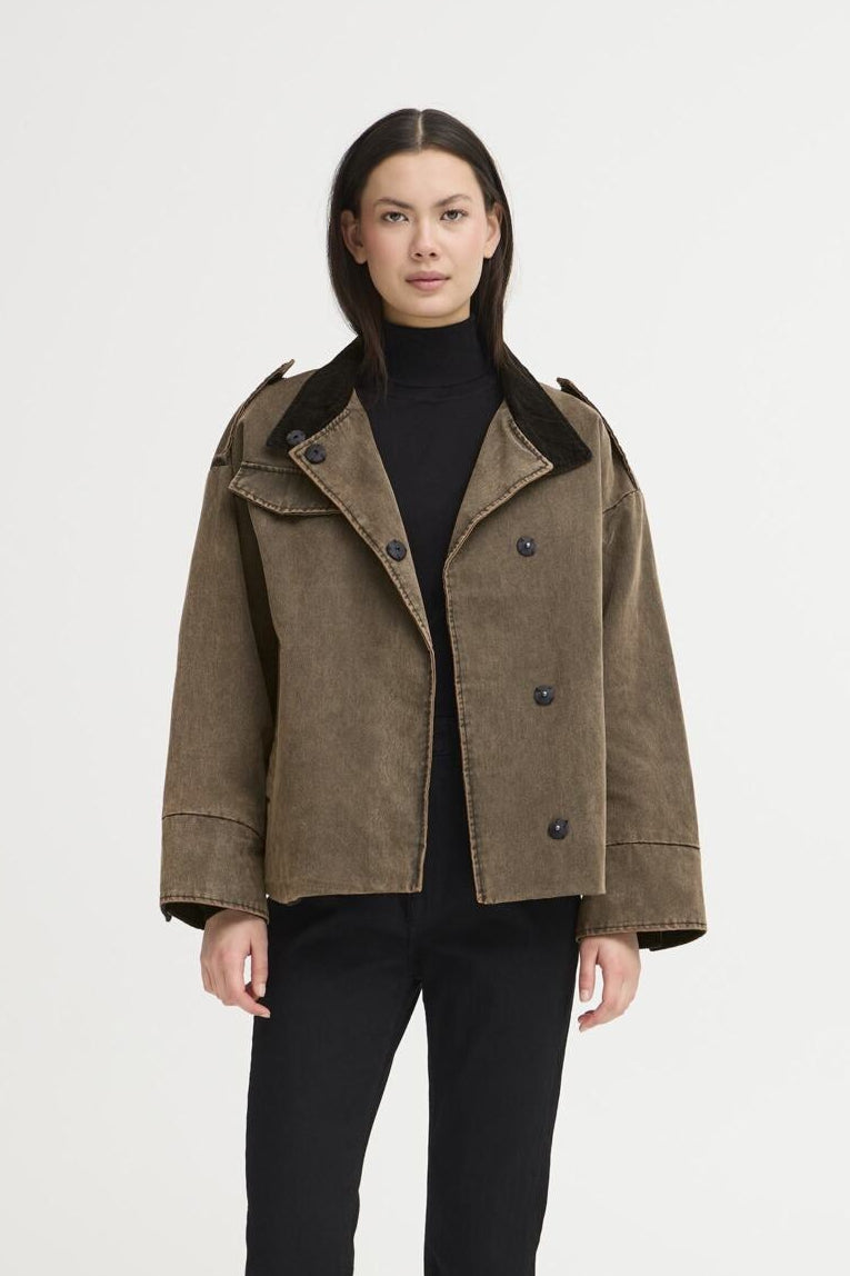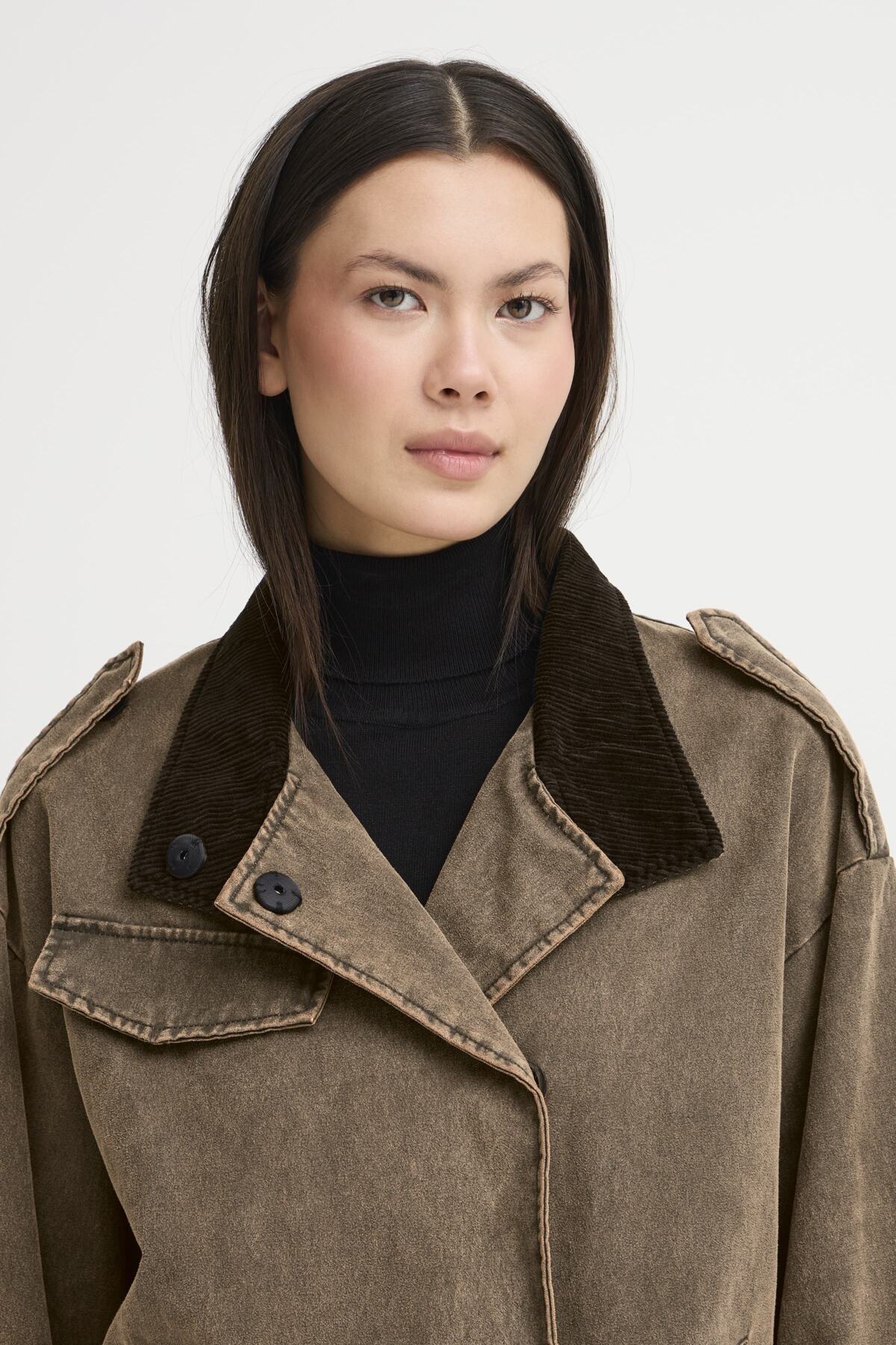 Abrigo tejido impermeable efecto desgastado, cuello en pana negra y solapas en hombros. Corte cuadrado con bolsillos frontales, cierre con botones de corchete ocultos. Talla amplio