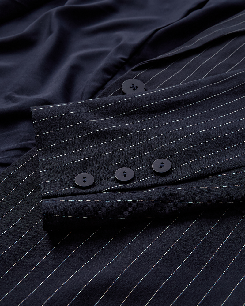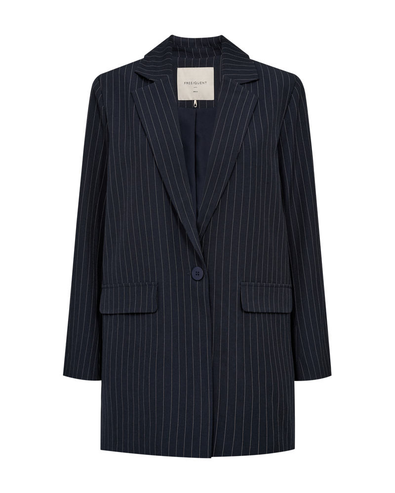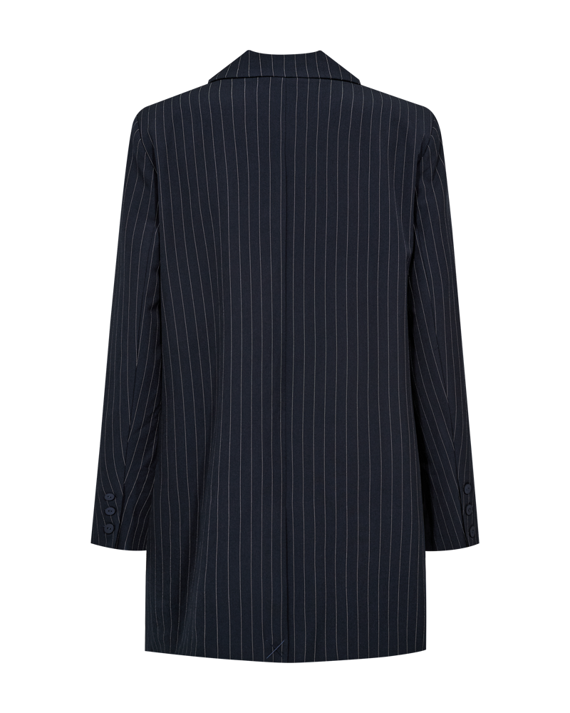 Americana en azul marino con raya diplomática en gris, corte recto con solapas t bolsillos frontales.