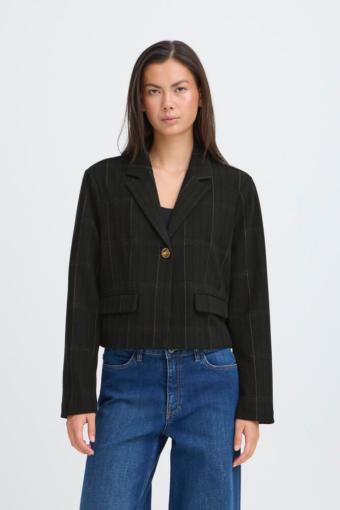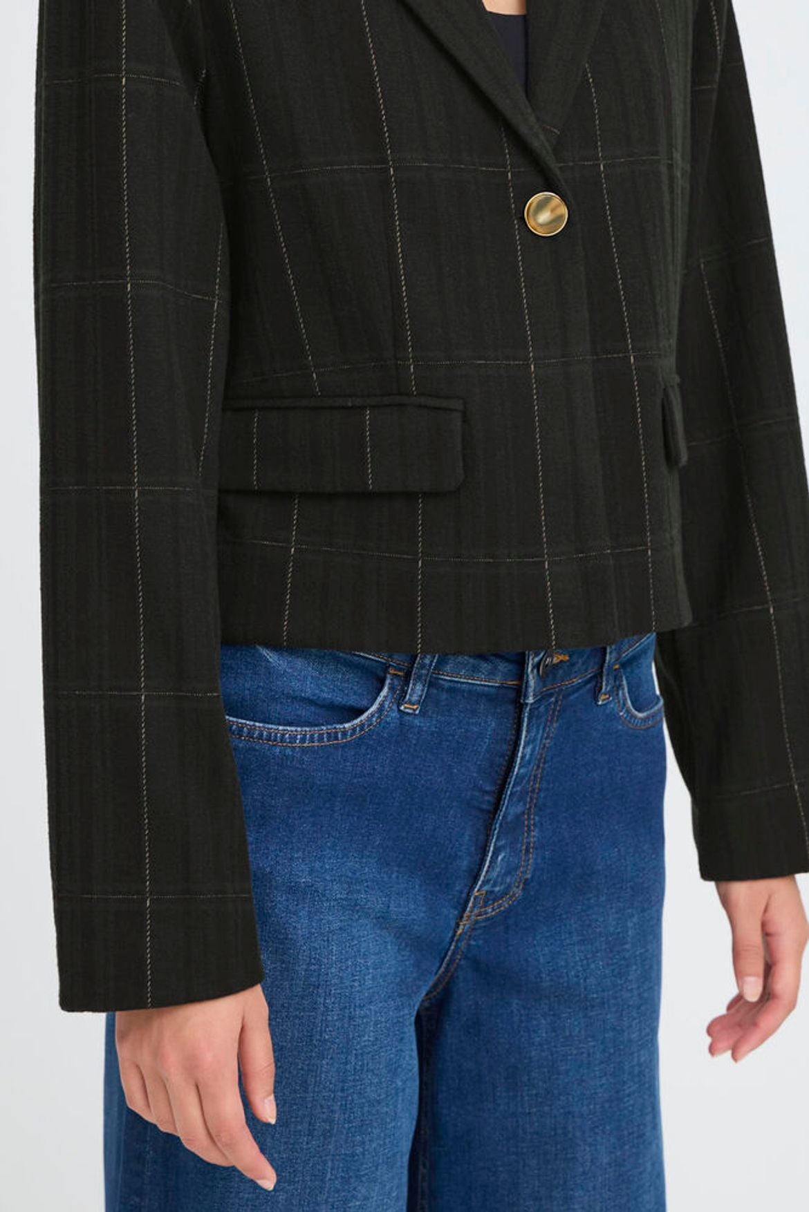 Americana corta cuadrada dibujo a cuadros negro y verde, cierre con un botón y bolsillos frontales.