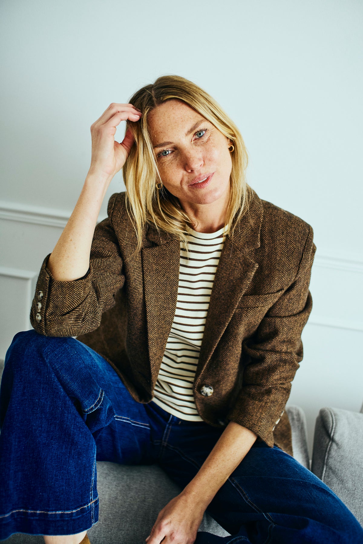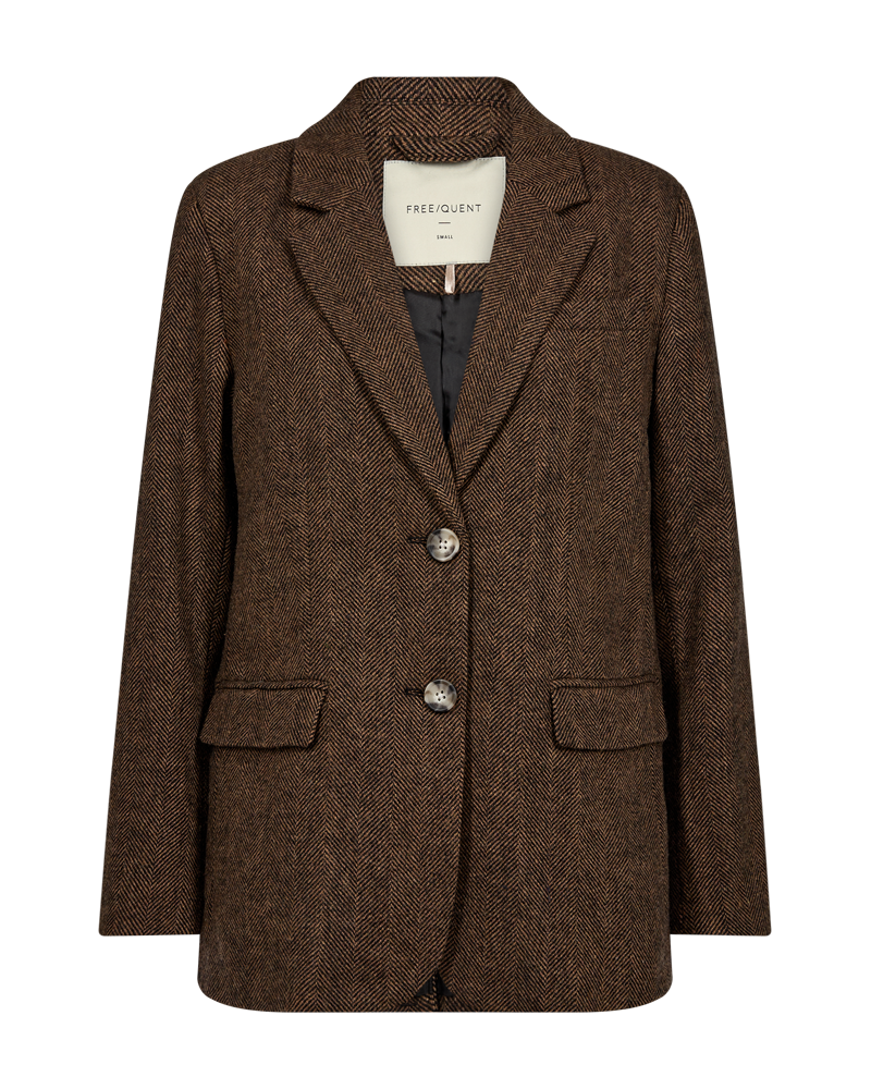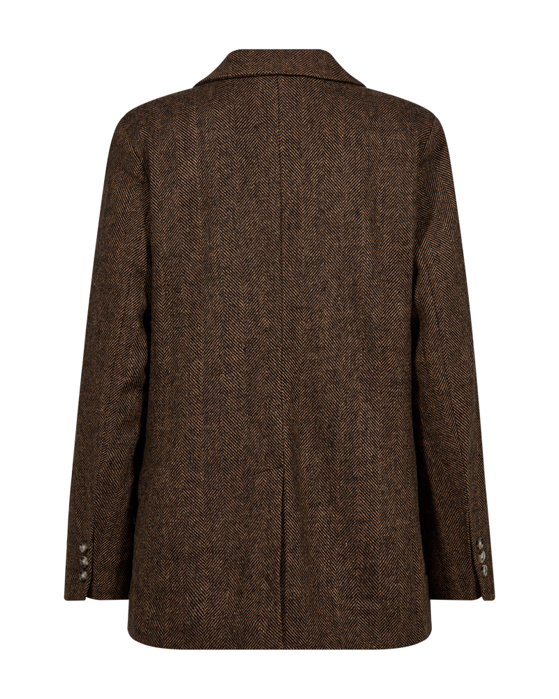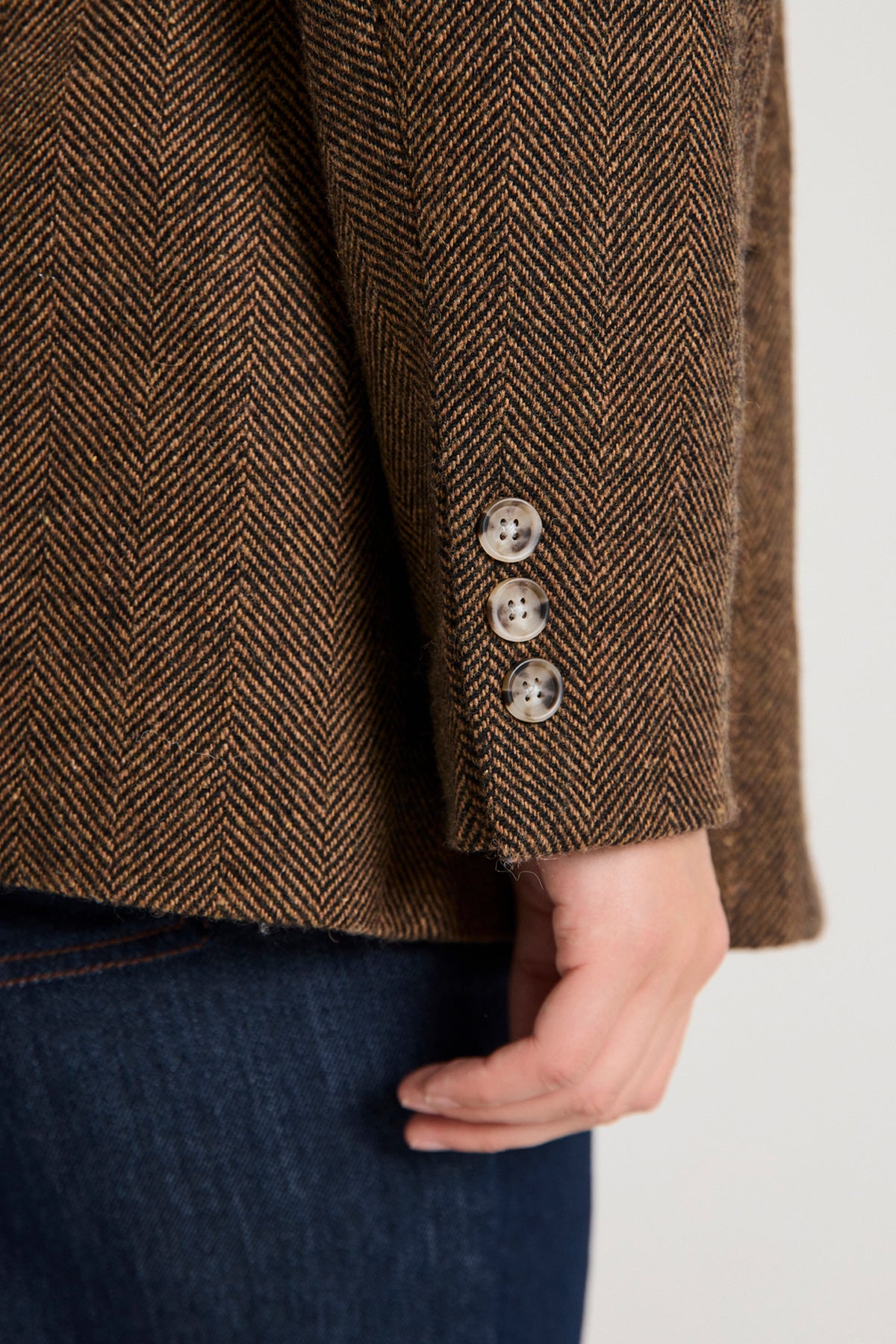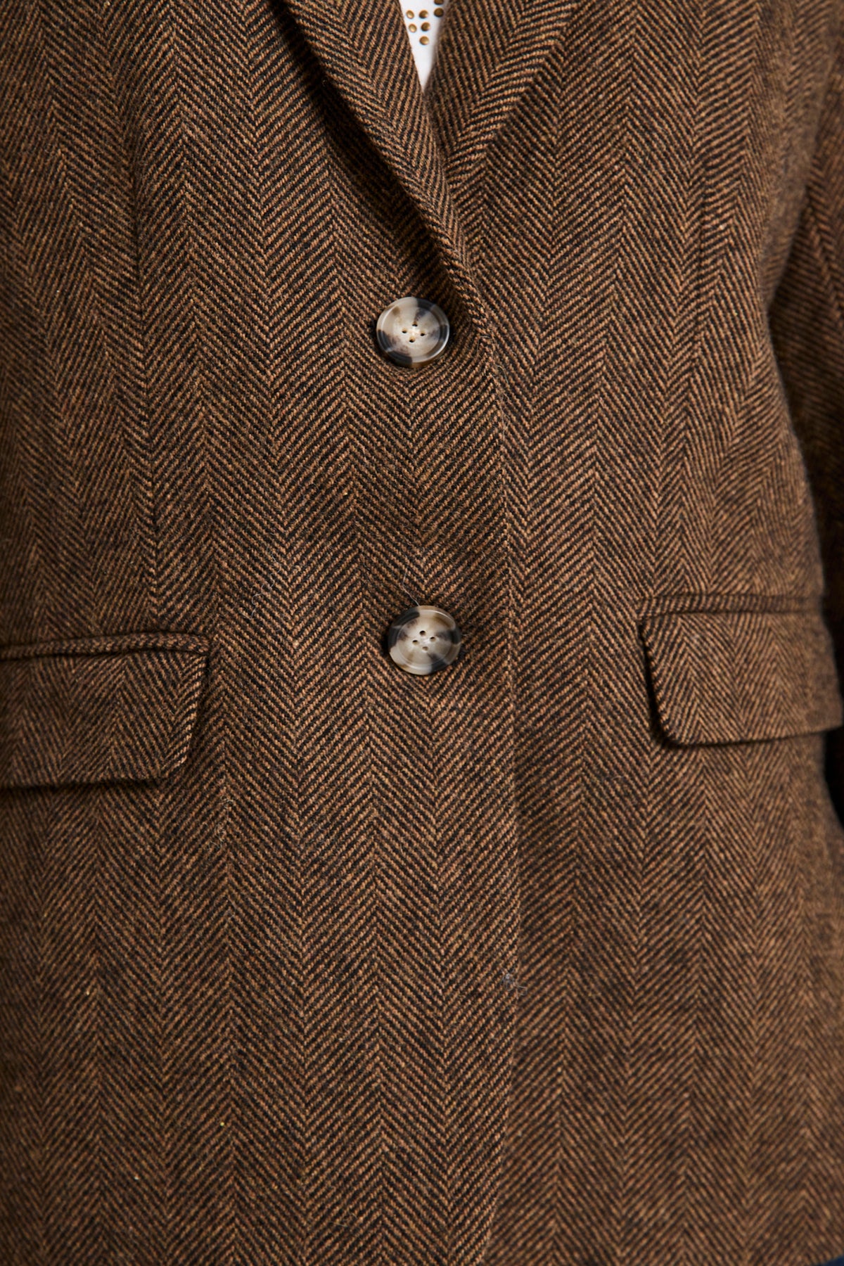 Americana en espiga verde y marrón, corte recto con solapas, bolsillos frontales y cierre con dos botones. Forro interior en negro.