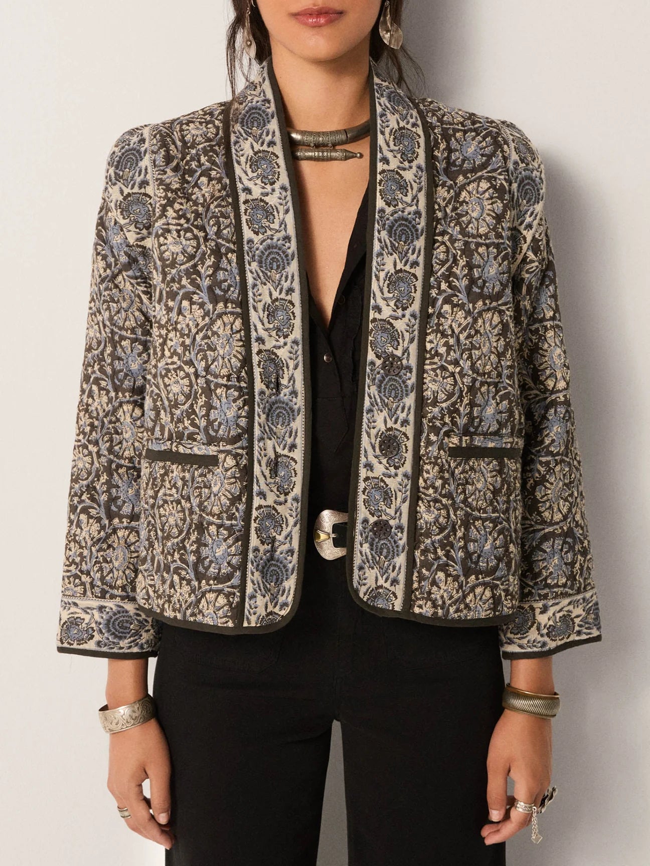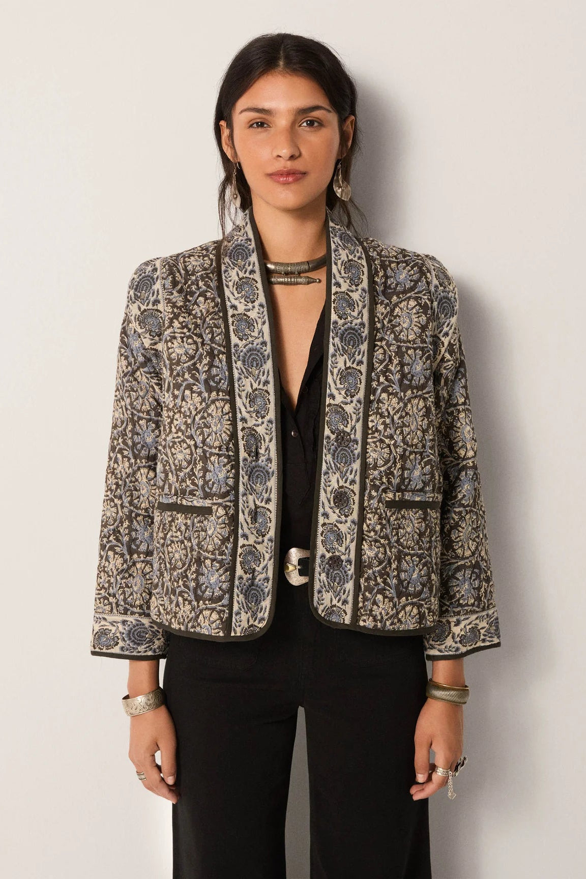 Cazadora acolchada estampada en azul y negro, detalle de hombros en pico, cierre con tres botones y bolsillos frontales.