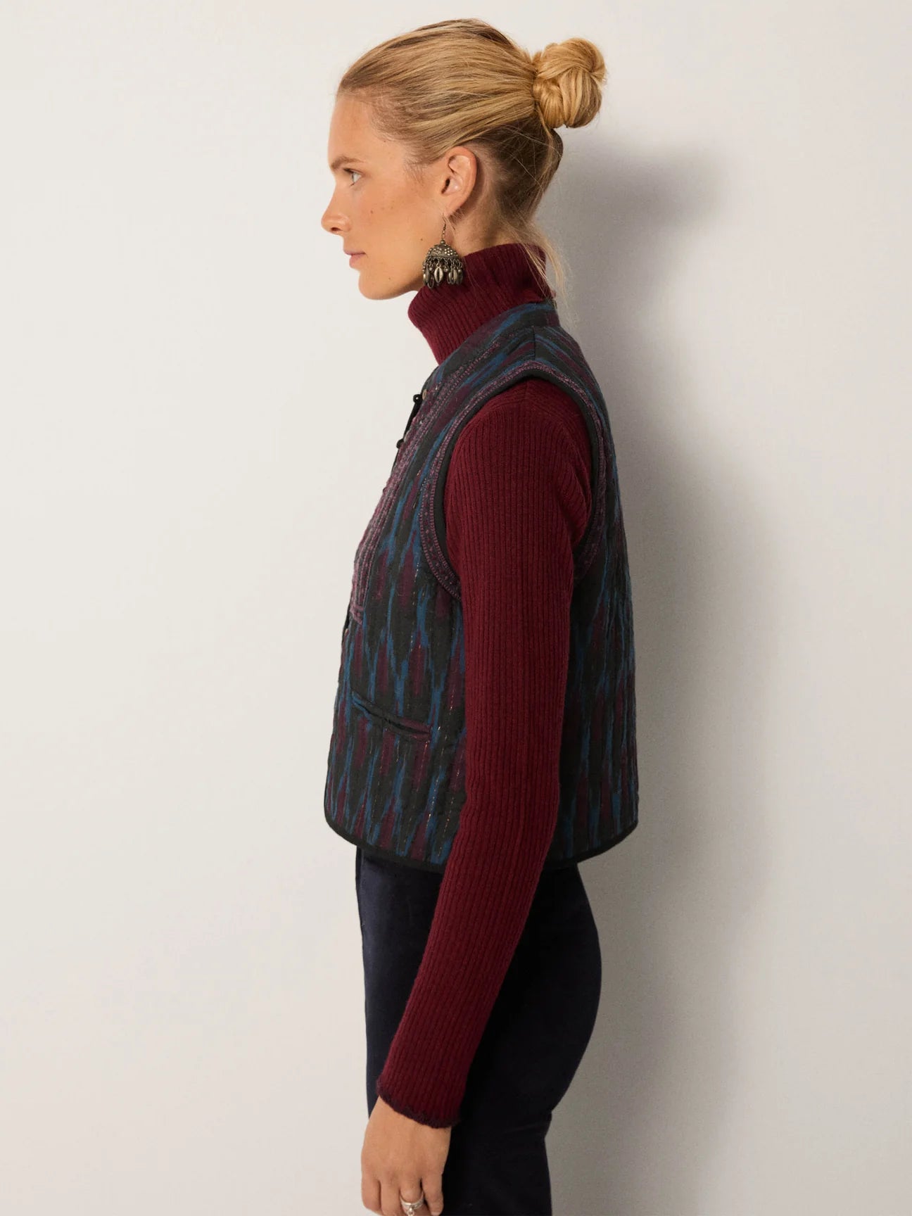 Chaleco estampado en tonos azules y violetas con lurex, botones de madera y bolsillos frontales. Detalle de pequeños círculos espejos en pecho.