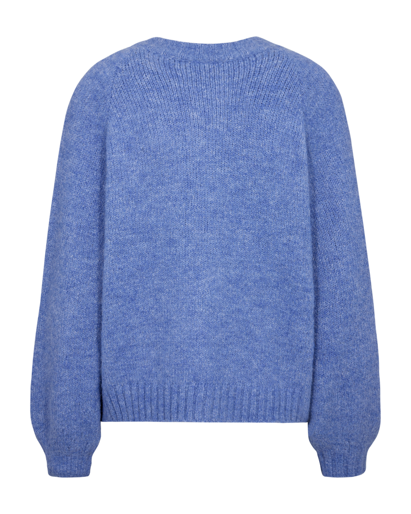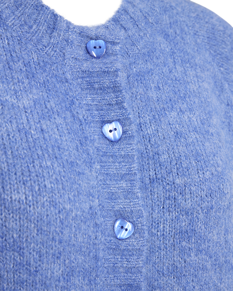 Chaqueta de punto en azul, cuello redondo con botones al tono, mangas abullonadas y acabados de canalé en puños y cintura.