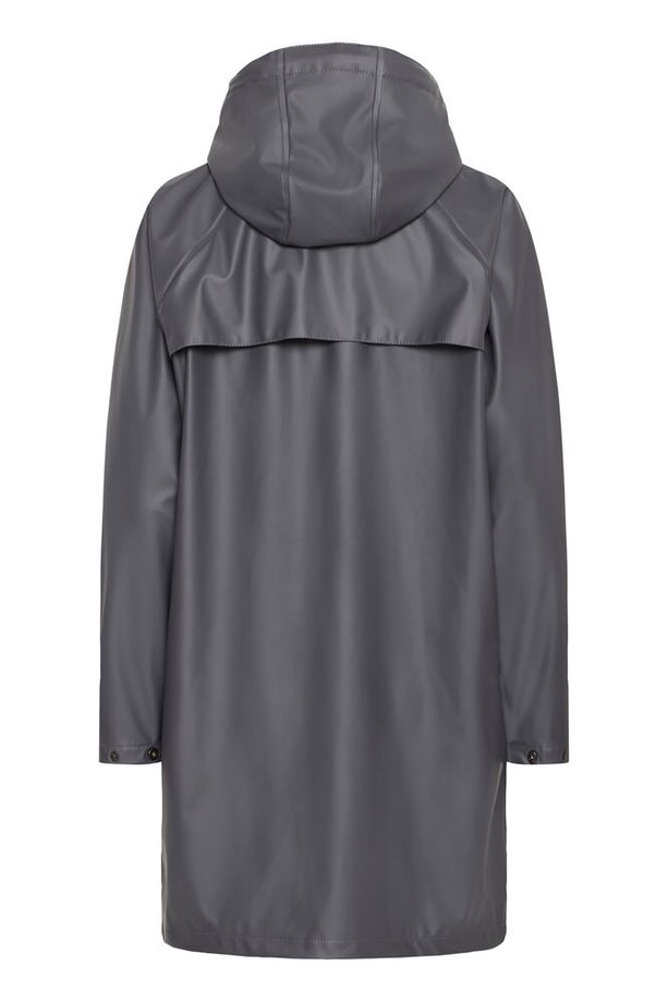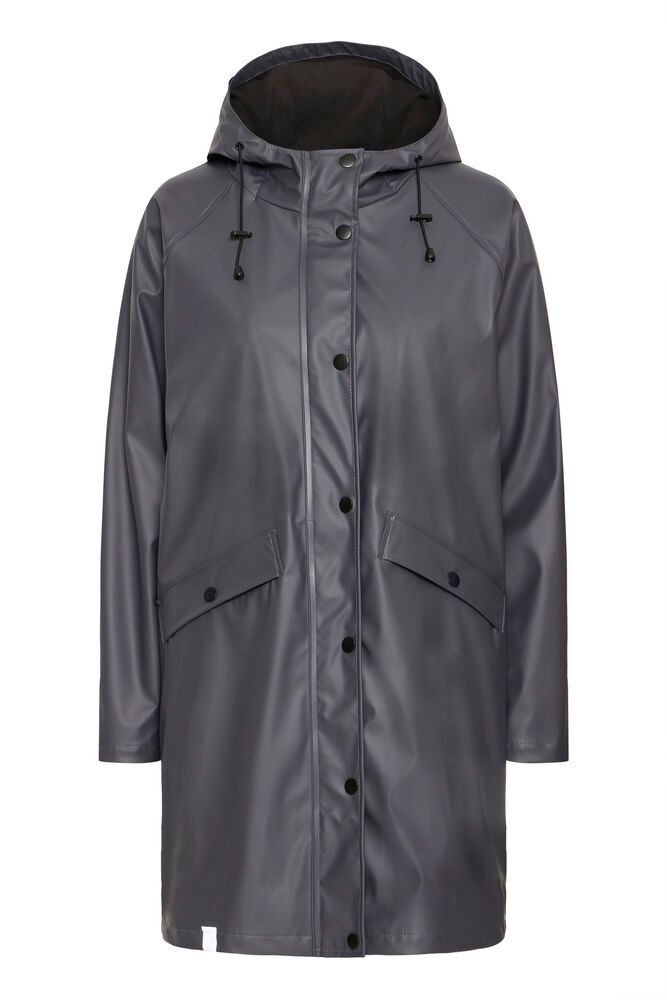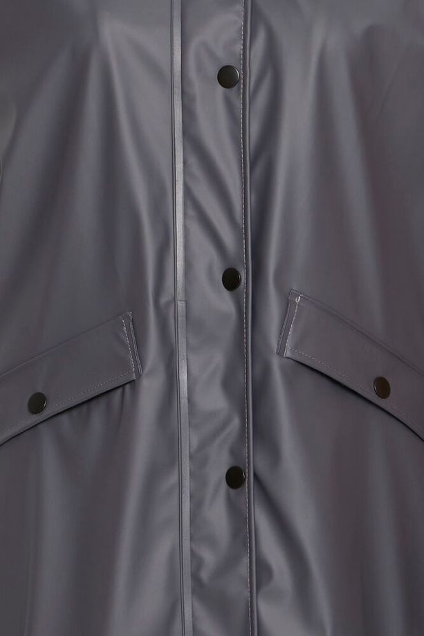 Chubasquero impermeable en gris oscuro, forrado en el interior con forro polar negro. Cierre con cremallera y botones de corchete, capucha y bolsillos laterales.