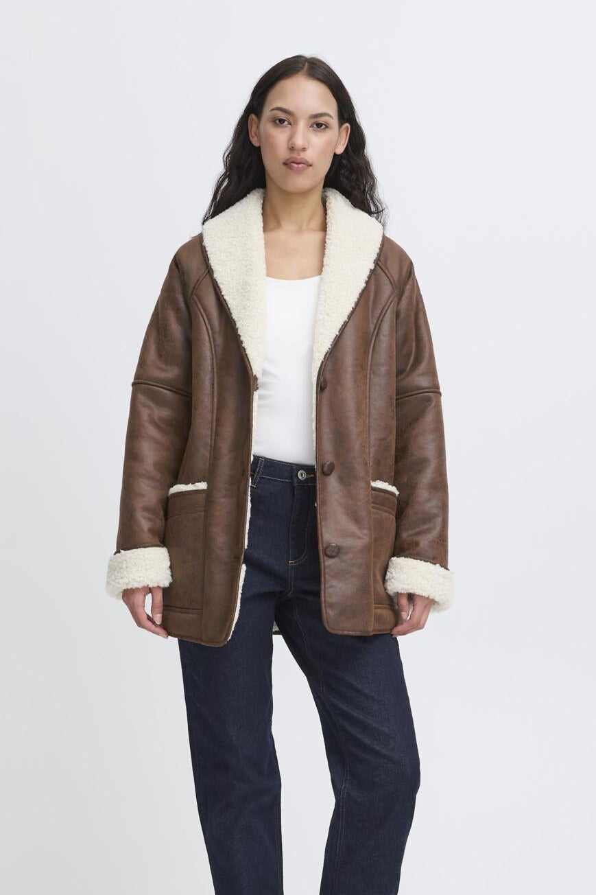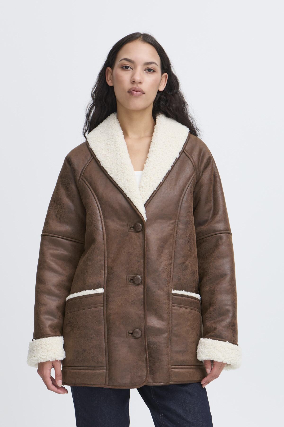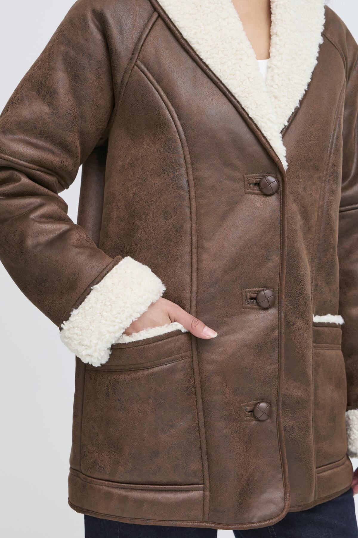 Pelliza marrón chocolate, borreguito interior y en cuello. Cierre con botones tipo trenca y bolsillos frontales.