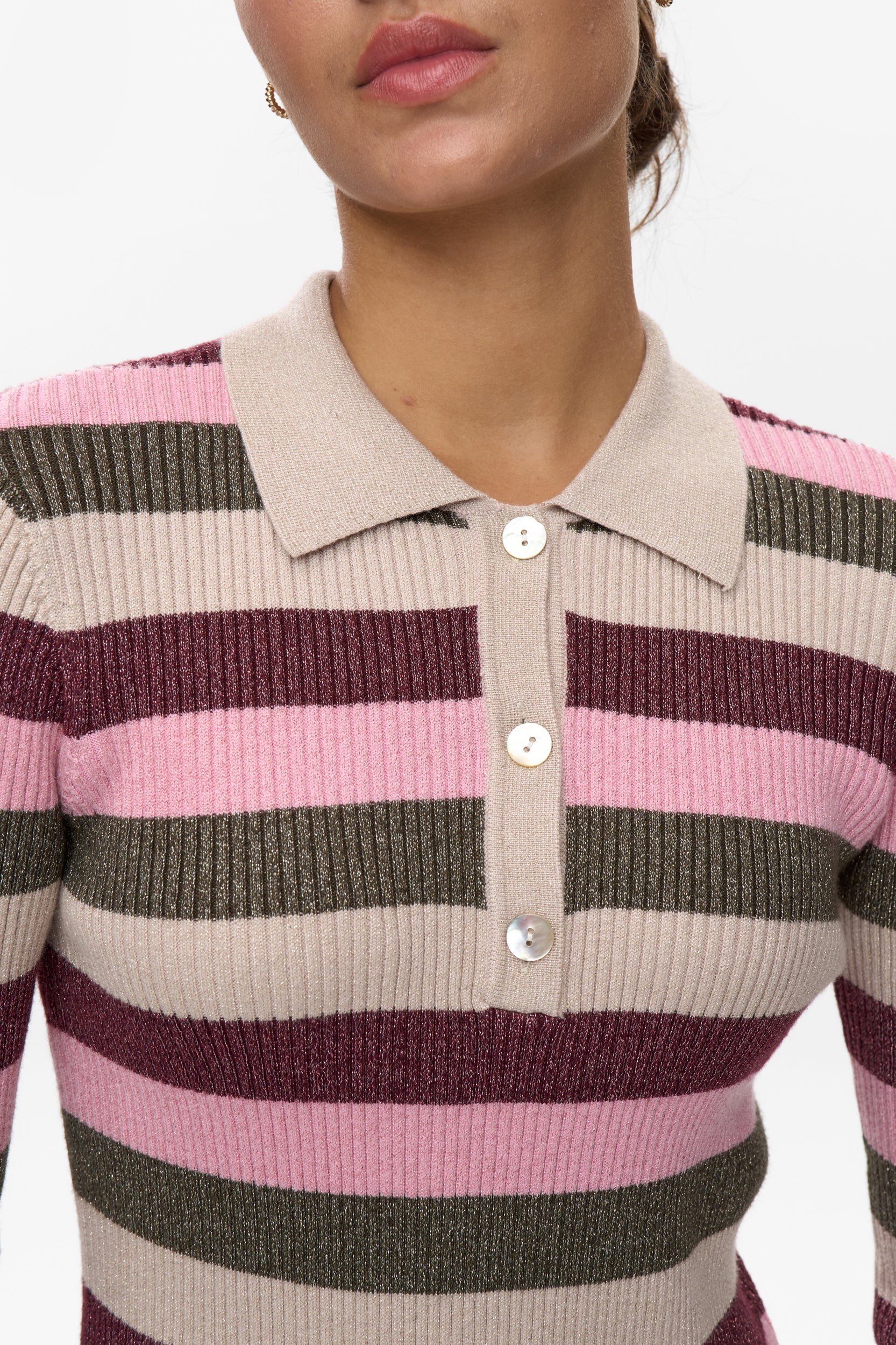 Polo en canalé con detalle de lurex en dorado, cuello pico con botones y cuello camisero. Canalé no muy entallado, talla bien.
