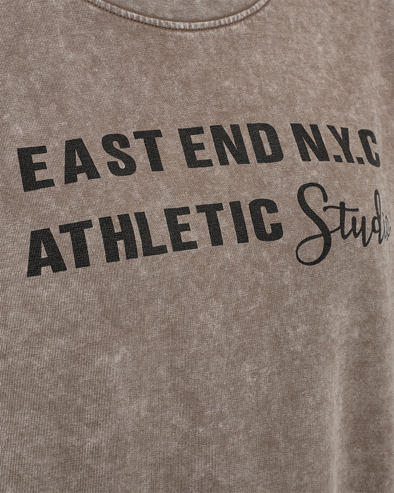 Sudadera color topo desgastada, manga ranglan y cuello redondo. Contraste de canalé en cuello, puños y cintura.